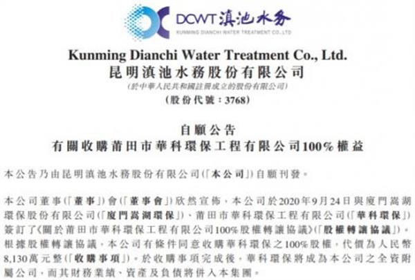 滇池水務(wù)8130萬元收購華科環(huán)保 污水處理業(yè)務(wù)繼續(xù)擴(kuò)大